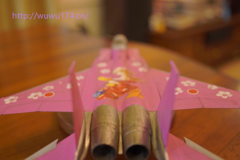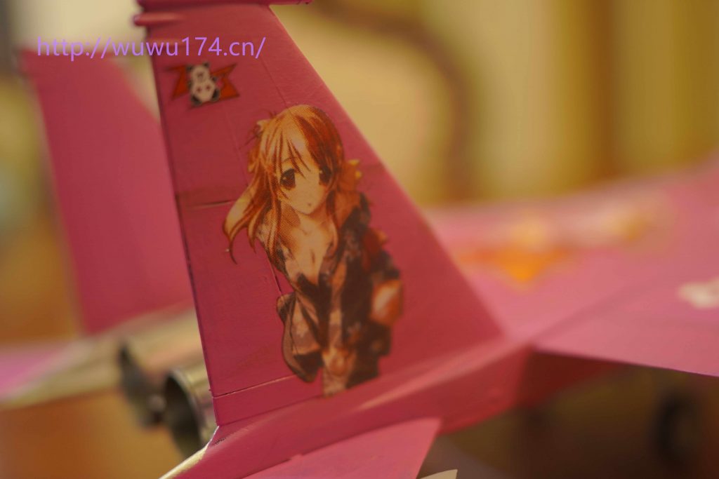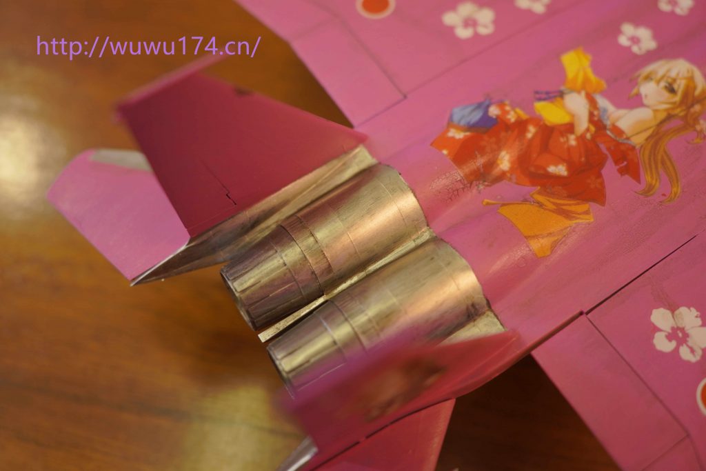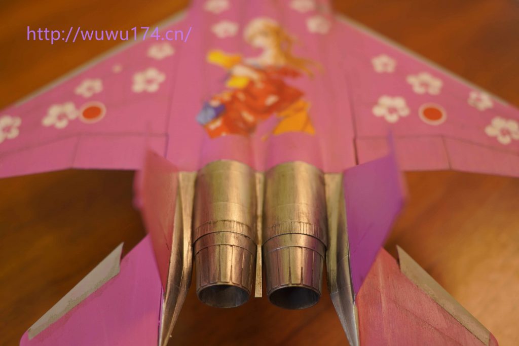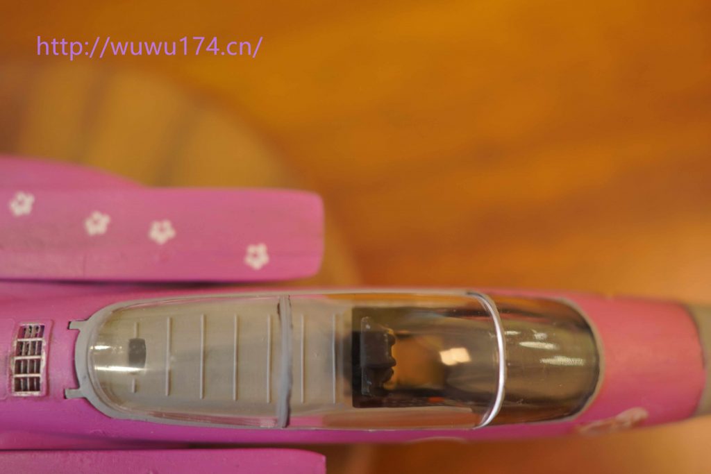光板座舱毫无细节,仪表给了一张水贴,但水贴开裂而且大小配不上。只能用F-8仪表水贴代替,反正到时盖上舱盖看不清。机身组合很简单上下组合,很快素组完成。手油(笔涂)黑色水补土,这次用AV粉红色,先涂第一遍,比想象中的好。然后机头分色和内舱上色。然后上第二次主色,对于大面积我喜欢一半一半上,先完成一半,再完成另一半,这样工作没有那么累。上第三层基本完美,F-15尾喷有金属板特征,我使用不锈钢色。这次水贴在网上选择囡囡水贴,再配上白花我个人认为挺好看,最后渍洗好像重手了很脏,不过我却很喜欢。