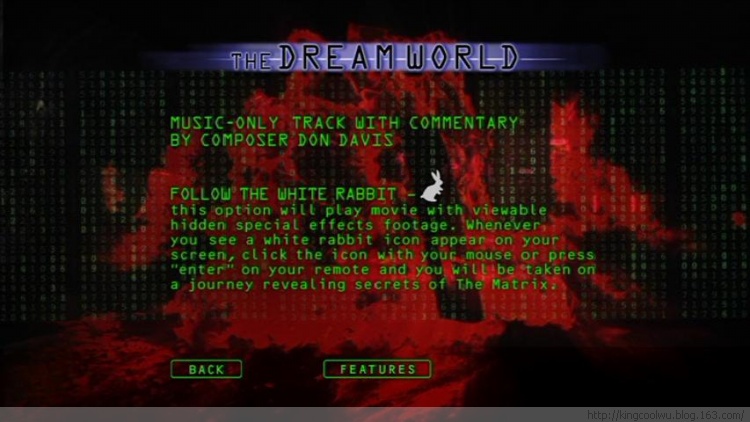 《黑客帝国》第一版DVD是DVD时代一个转折点,第一批D9电影和第一张带有互动功能玩法DVD,不过第一版由于发行时间比较早所以画质并不是很好,色调与第二第三集不同,当然后来新出修复版本修改了色调和增强了清晰度,比HDTV的1080I版本还要清晰,只不过取消了互动模式玩法,其实小白兔功能并不是指DVD里的一个功能,只是当时还没有一个统称,而且第一张互动DVD的入口是小白兔所以以后所称这种功能为小白兔。其实玩法很简单。来把玩一下进行回忆吧!