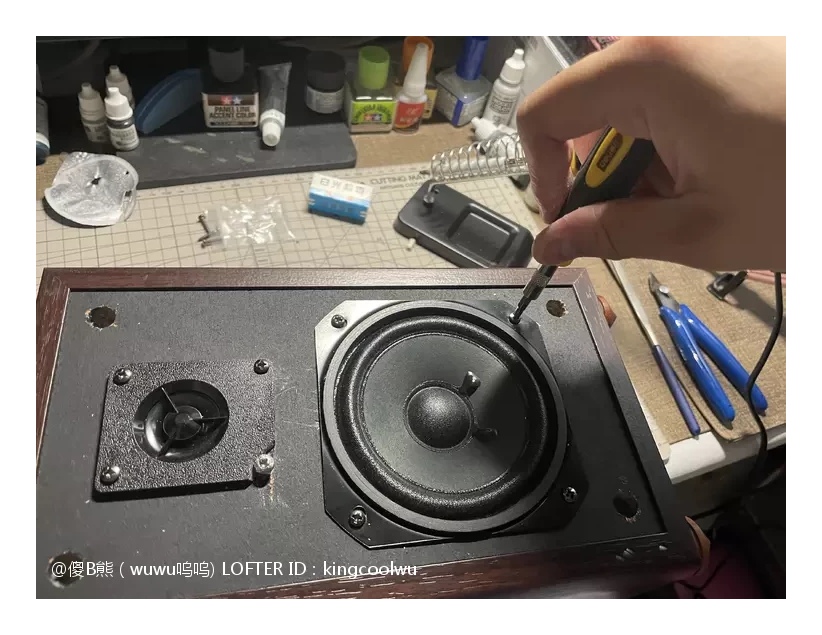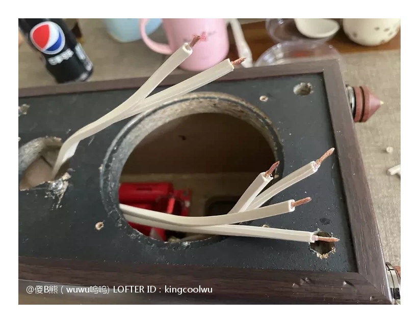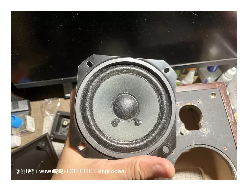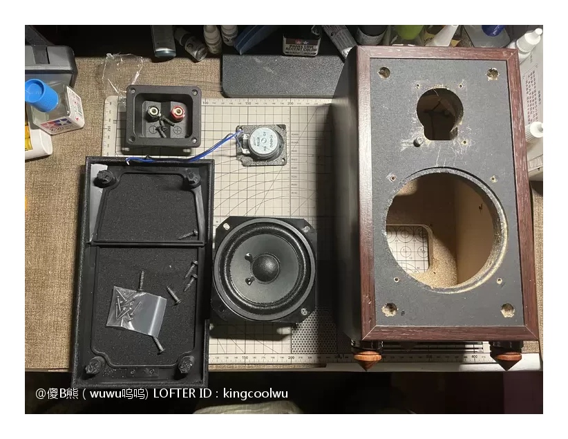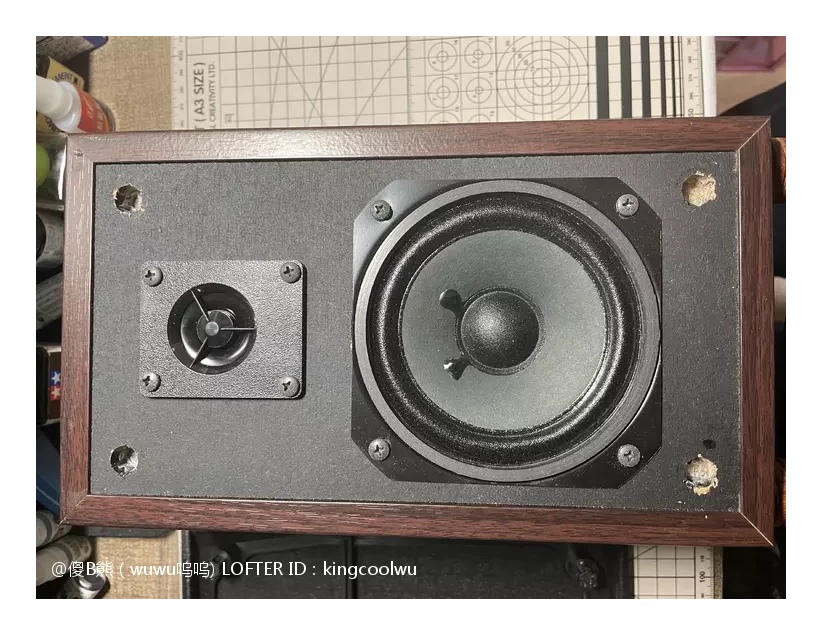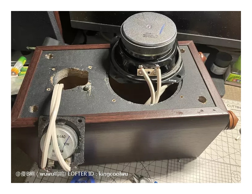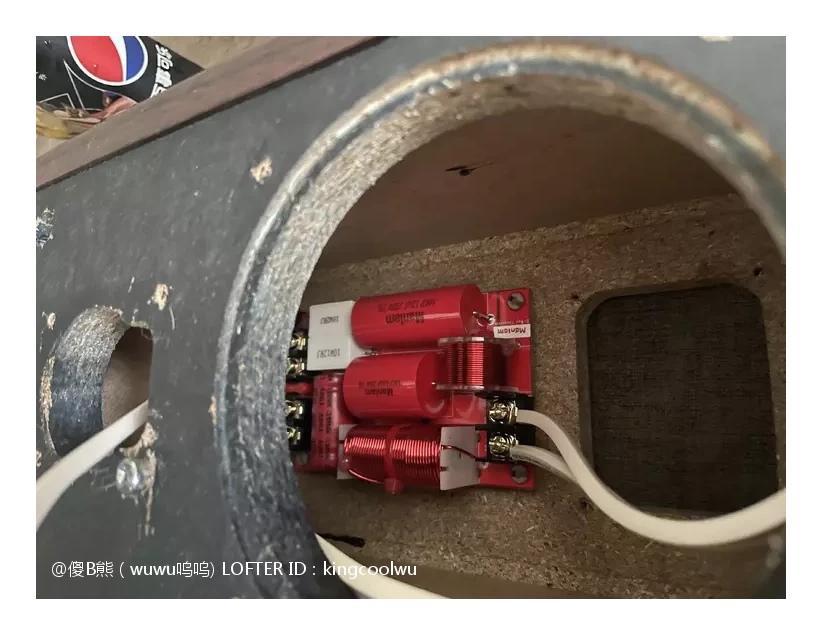将分频器放入音箱内使用热融胶固定,总共有三处接线,分别是输入端子,中音喇叭和高音喇叭,分好正负连线就可以了。最后面版和喇叭涂上胶水密封上螺丝就完成了。由于原配就没有吸音棉,加上喇叭能量也不大箱声不重,不加吸音棉也可以,免得加了反而有反效果。最后接上功放时时,加了分频器高中频分开了更清晰了舒服很多。之后将另一只音箱拆开加分频器制作过程一样,一对音箱又重生了……