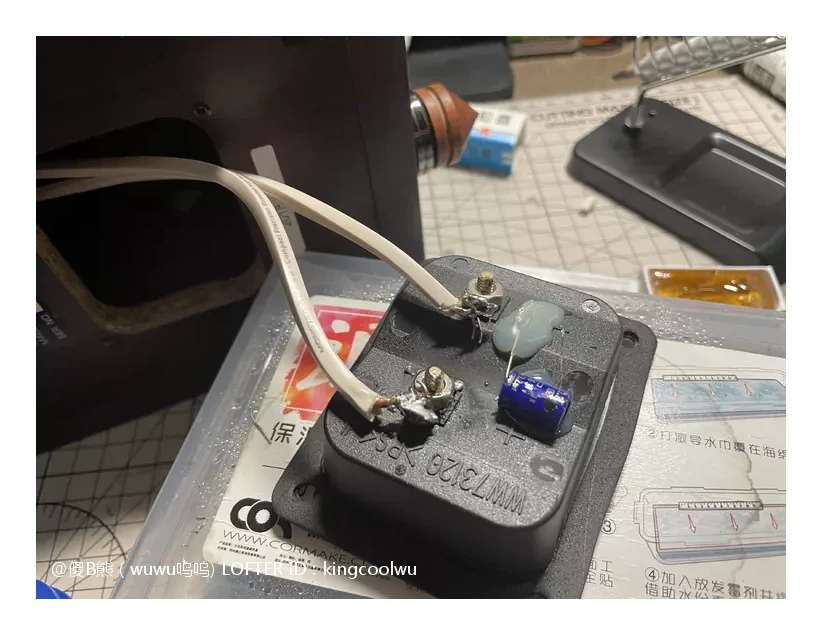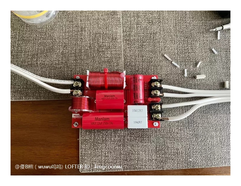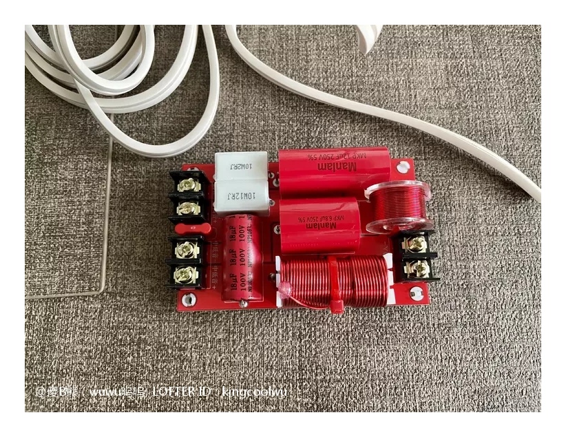 分频器到手了,先做接线准备。分频器作用就是将高低频信号分开交给合适喇叭工作。
