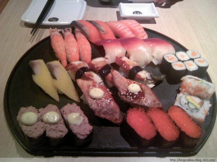 哈哈哈,真是头脑发热了,点了盘大寿司拼盘,原来计算落大寿司拼盘比单点要优惠的多,而且饭少鱼生片够大,真是正。。