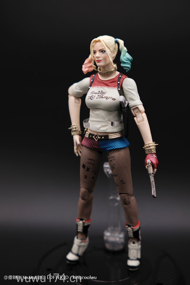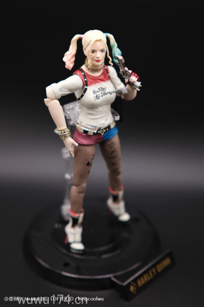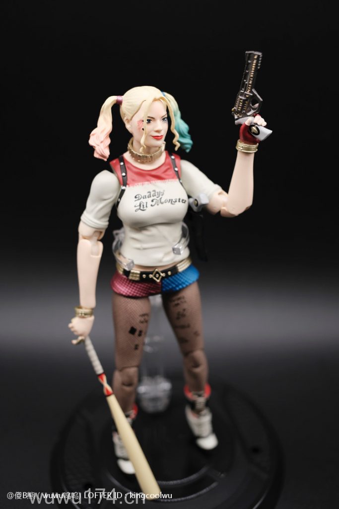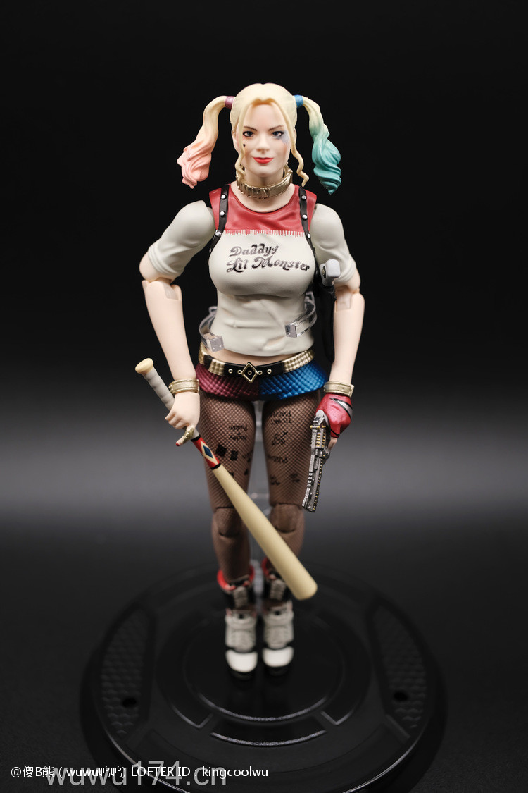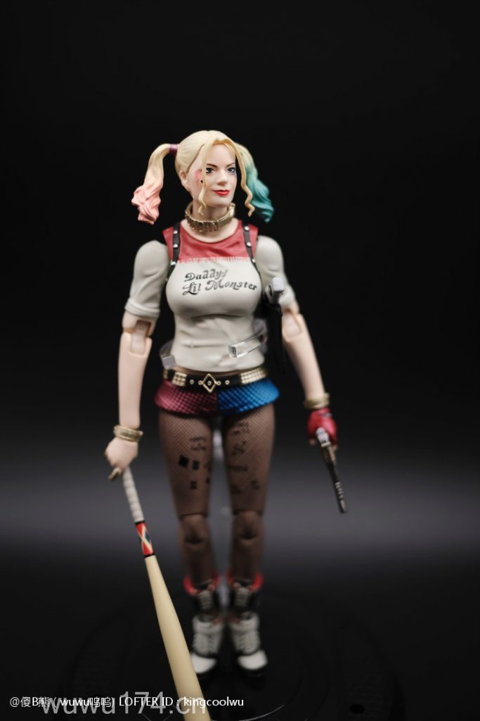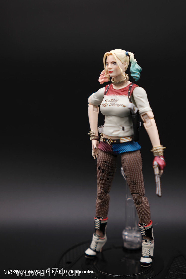 说实话,开头我不是很喜欢小丑女。记得她登场在自杀小队吧!那时不懂欣赏。反而在她独立电影里表现非常出色,所以也入手这个手办。国产牌子拥有DC正版授权,价钱才80大洋;无错是80大洋,比起不知名山寨作坊贵10元而已!当然价钱摆在哪里,我换她左手时候关节球就断了一半了,无法拔出导致无法换手型。带多一个笑容头雕,原本头雕不像像COS那种;带笑容头雕有点搞笑,斗鸡眼,哈哈,成个啊仪感样!!!!!!!除了左手关节有问题外,基本上都算不错了。