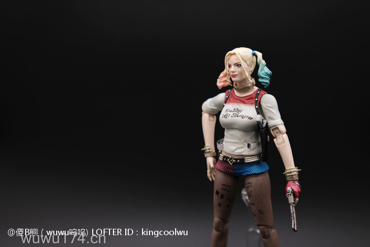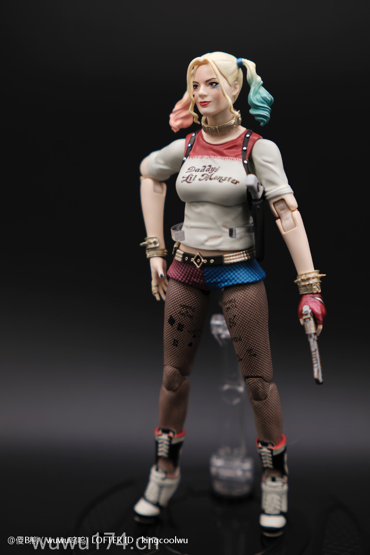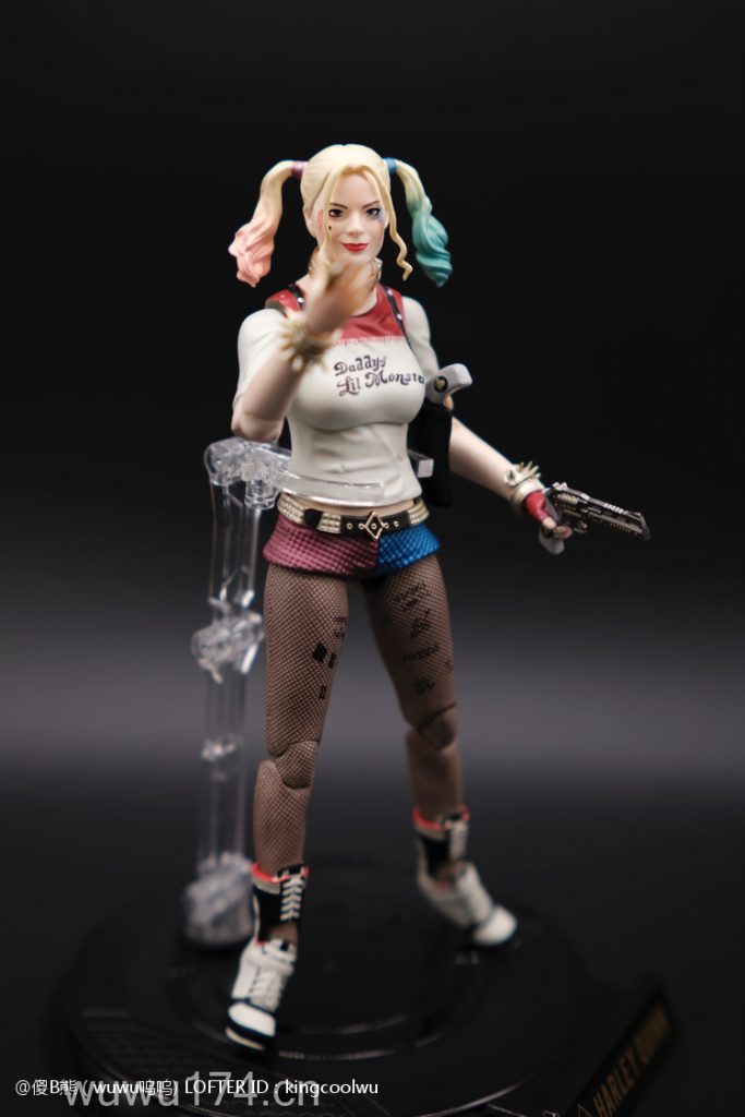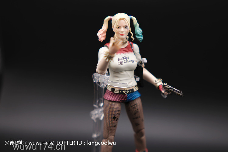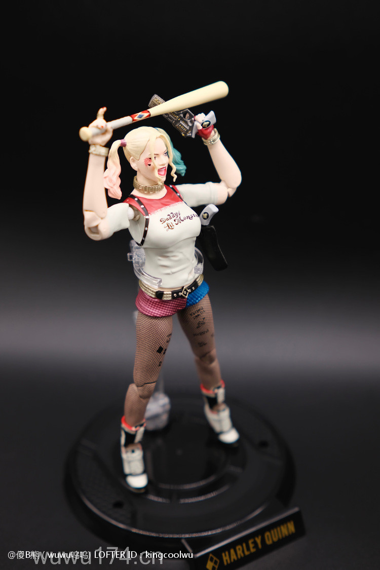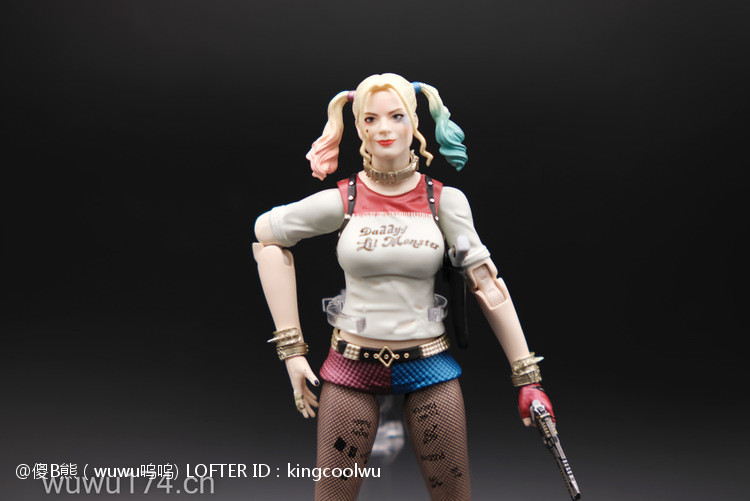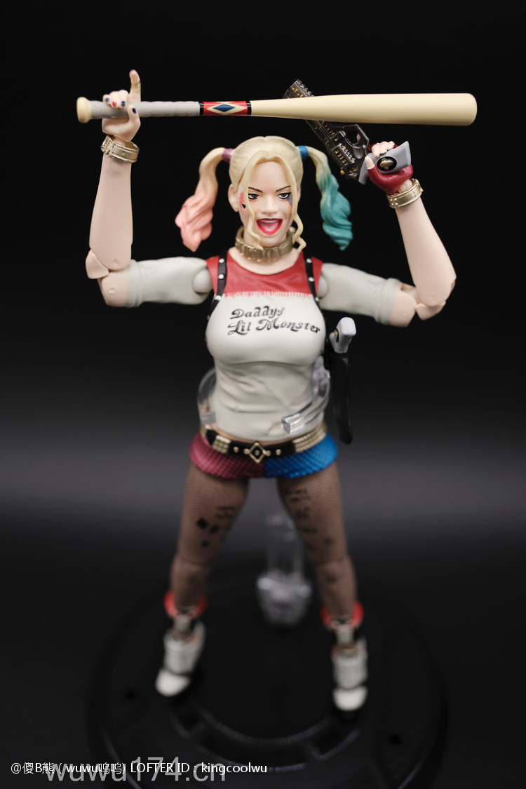 说实话,开头我不是很喜欢小丑女。记得她登场在自杀小队吧!那时不懂欣赏。反而在她独立电影里表现非常出色,所以也入手这个手办。国产牌子拥有DC正版授权,价钱才80大洋;无错是80大洋,比起不知名山寨作坊贵10元而已!当然价钱摆在哪里,我换她左手时候关节球就断了一半了,无法拔出导致无法换手型。带多一个笑容头雕,原本头雕不像像COS那种;带笑容头雕有点搞笑,斗鸡眼,哈哈,成个啊仪感样!!!!!!!除了左手关节有问题外,基本上都算不错了。