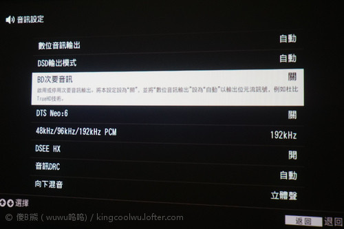 音频设置,数位音频、DSD音频选择自动;BD次音频关了,这机和以往不同,以往机型开了dtshd 只会传内核,这机开了会转变LPCM输出;dts neo6 这类混音选择关,交给功放去混效果比碟机做要好得多;PCM升频选择最高192K,遇到两声道音频统一升频,特别一些旧片只有两声道优化会好点;DEEH HX开启,同样也是优化低流码音频的;