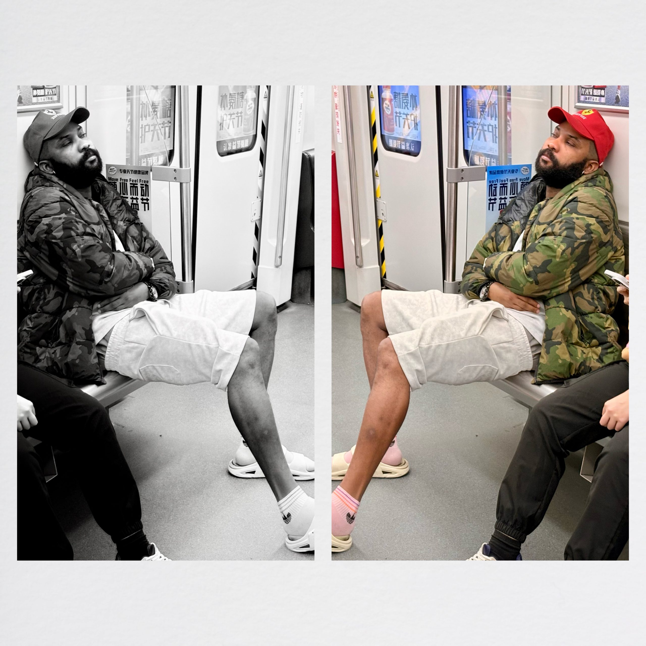 在地铁车厢里,一眼就看到靠窗的座位上,一位留着络腮胡的外国友人正睡得沉。他裹着迷彩外套,双腿舒展,头靠在车厢壁上,连地铁的颠簸都没能惊扰他的梦境。左边的黑白影像里,他的轮廓在冷调中显得格外沉静;右边的彩色画面里,红色棒球帽和粉色袜子却又添了几分鲜活的反差。他像是这座城市里的异乡客,在拥挤的车厢里找到了片刻的松弛,仿佛周遭的喧嚣都与他无关。