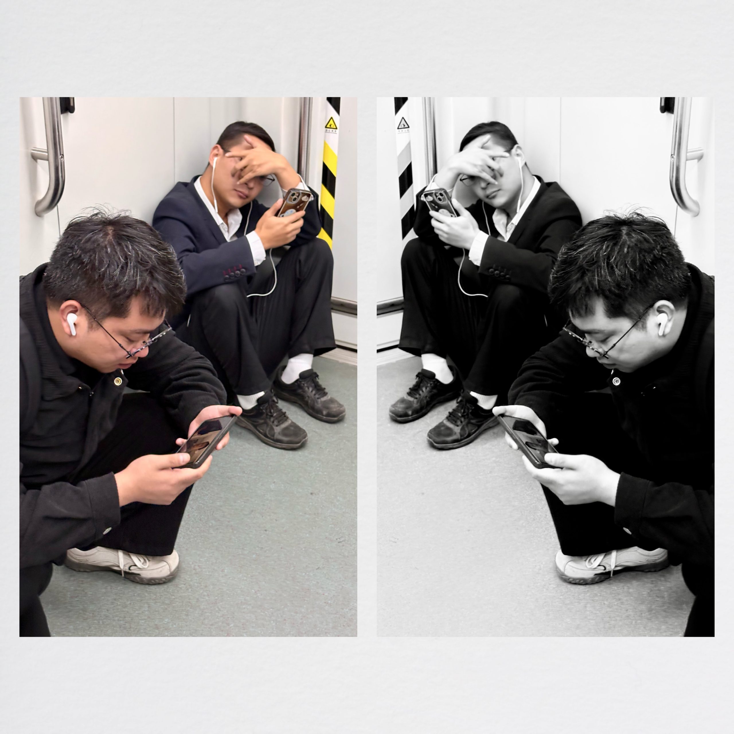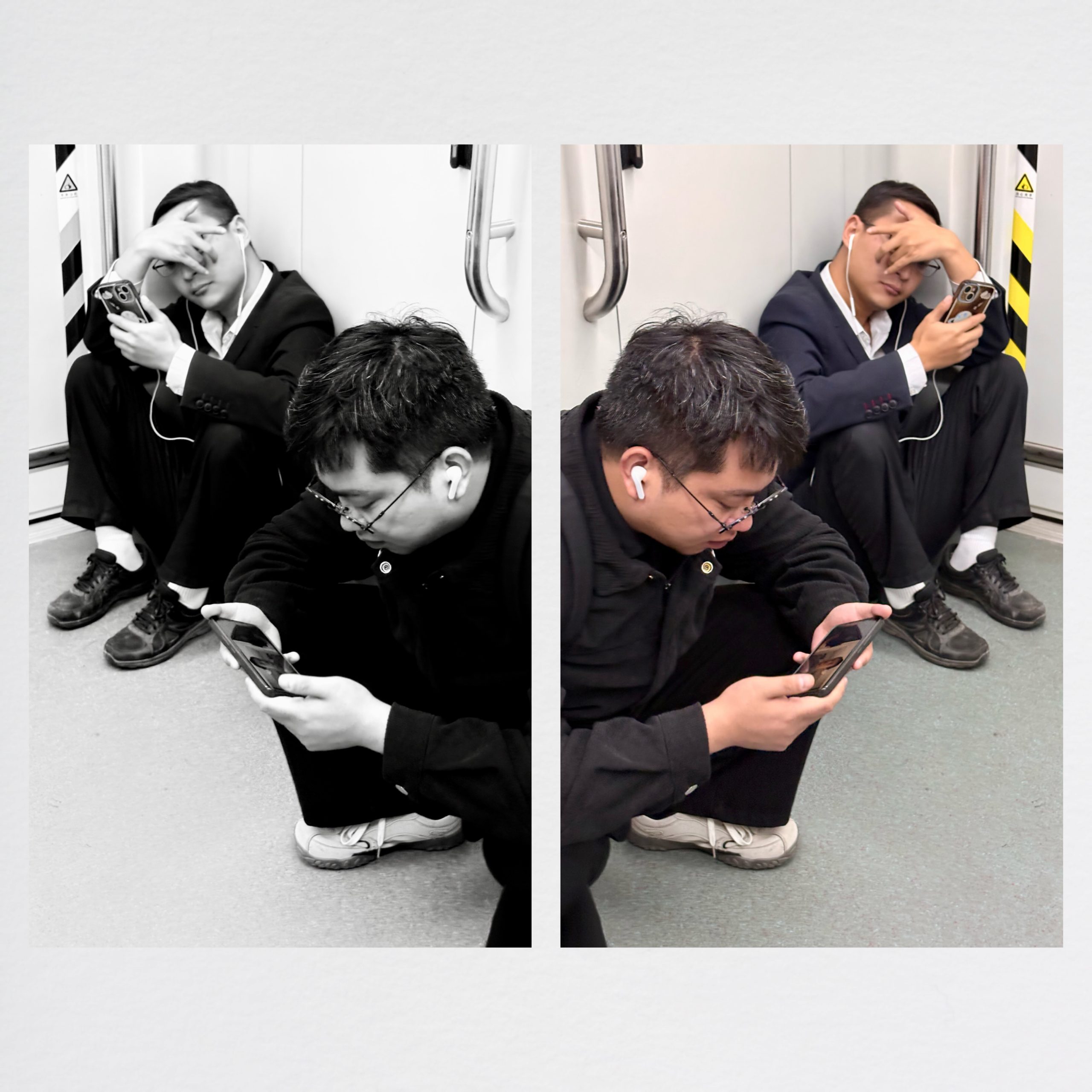 车厢另一角,两个年轻人的“捞头蹲”则是另一种日常。他们蜷在车厢连接处,西装外套搭在肩上,耳机线垂在膝头,一只手死死捂住额头,另一只手紧紧攥着手机,指尖在屏幕上飞快滑动。黑白影像里,他们的姿态显得有些疲惫,像是被工作和信息流裹挟着无法脱身;而彩色画面里,西装的褶皱和手机的反光,又让这份疲惫多了几分具象。他们是这座城市里最常见的身影,在通勤的间隙里,用手机短暂逃离现实,又在现实里继续奔波。
