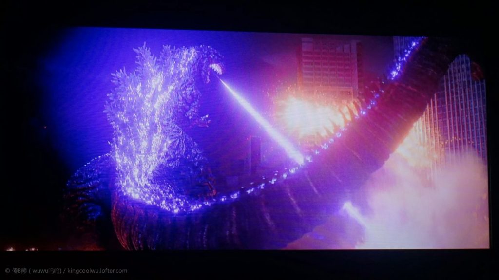 关于画质,画面清晰度很高,但好明显加了过滤器导致有种不影响清晰度有趣朦胧感。整个画面由于做旧显得偏黄原有色彩明显受到抑制,而导致人物肤色很暗淡,不过也很配合电影场景显得一群官僚面色更严肃。而哥斯拉质地前所未有好,皮肤纹路很凸现配合影像颜色很恐怖。