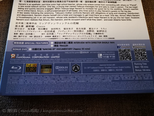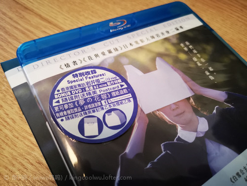 说回蓝光碟,是蓝光BD+DVD配置,蓝光BD除了正片外,还带独家导演专访;而DVD是拍摄花絮。还附带有明信片,笔记本和纸猫仔帽折纸,相当之有诚意。