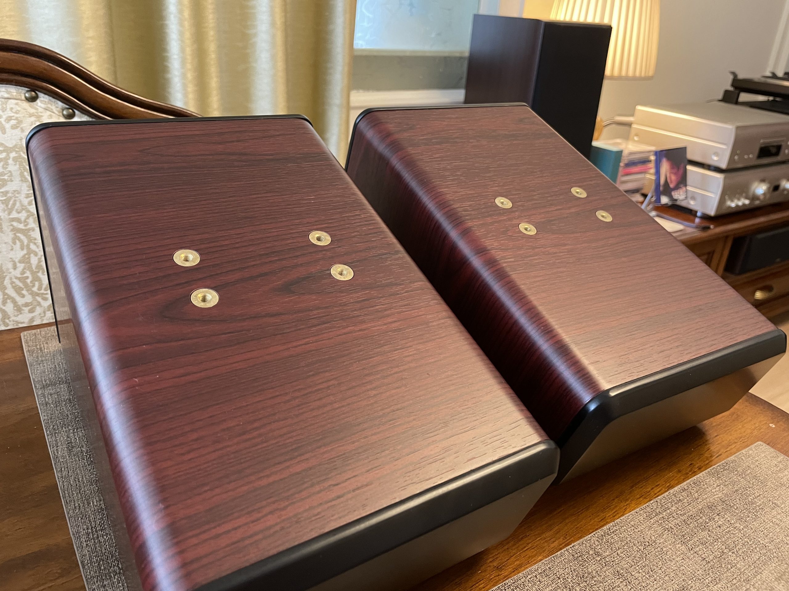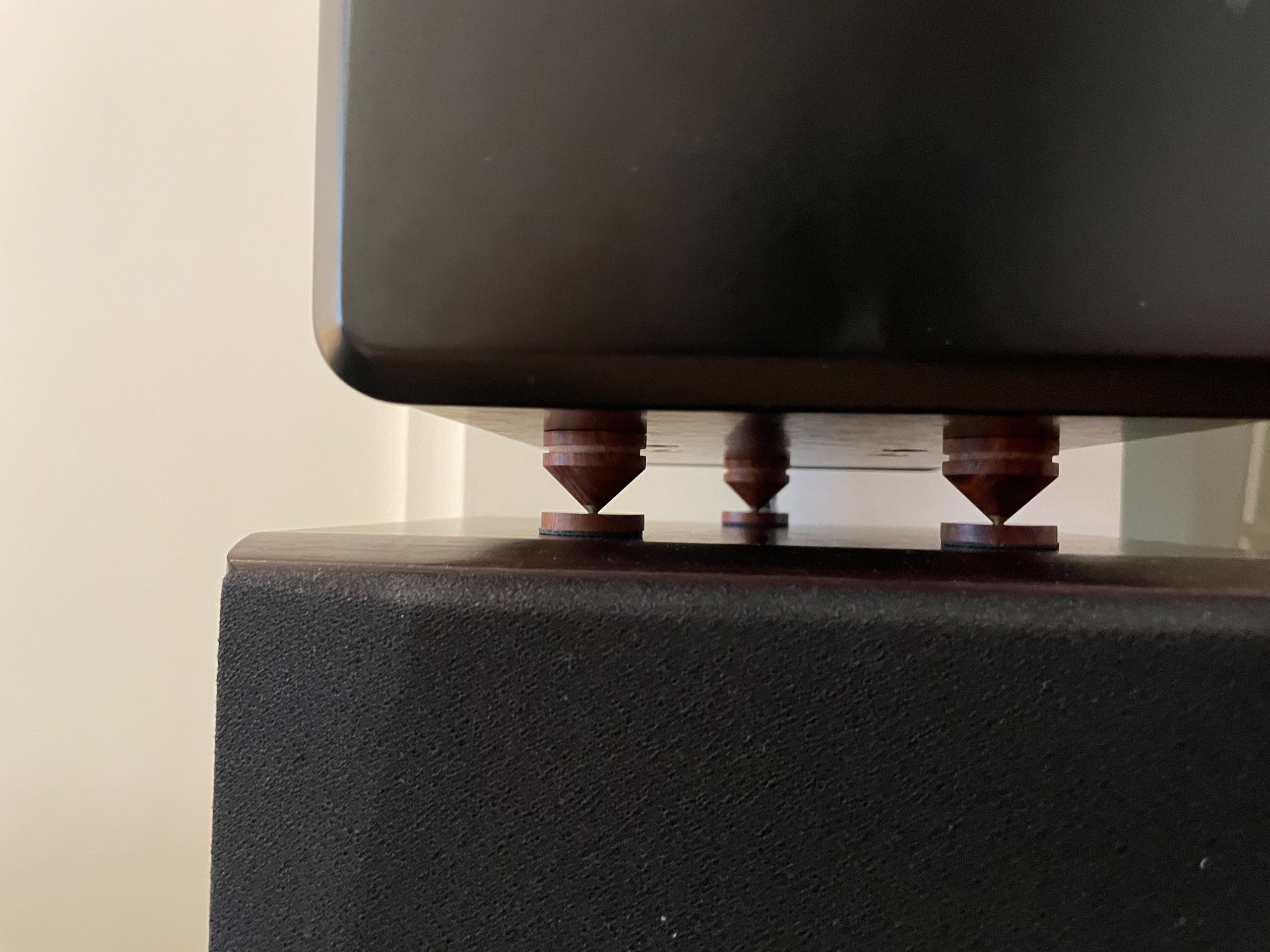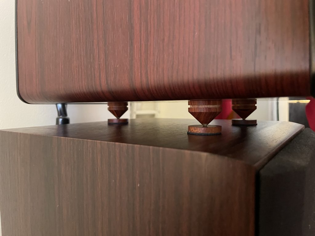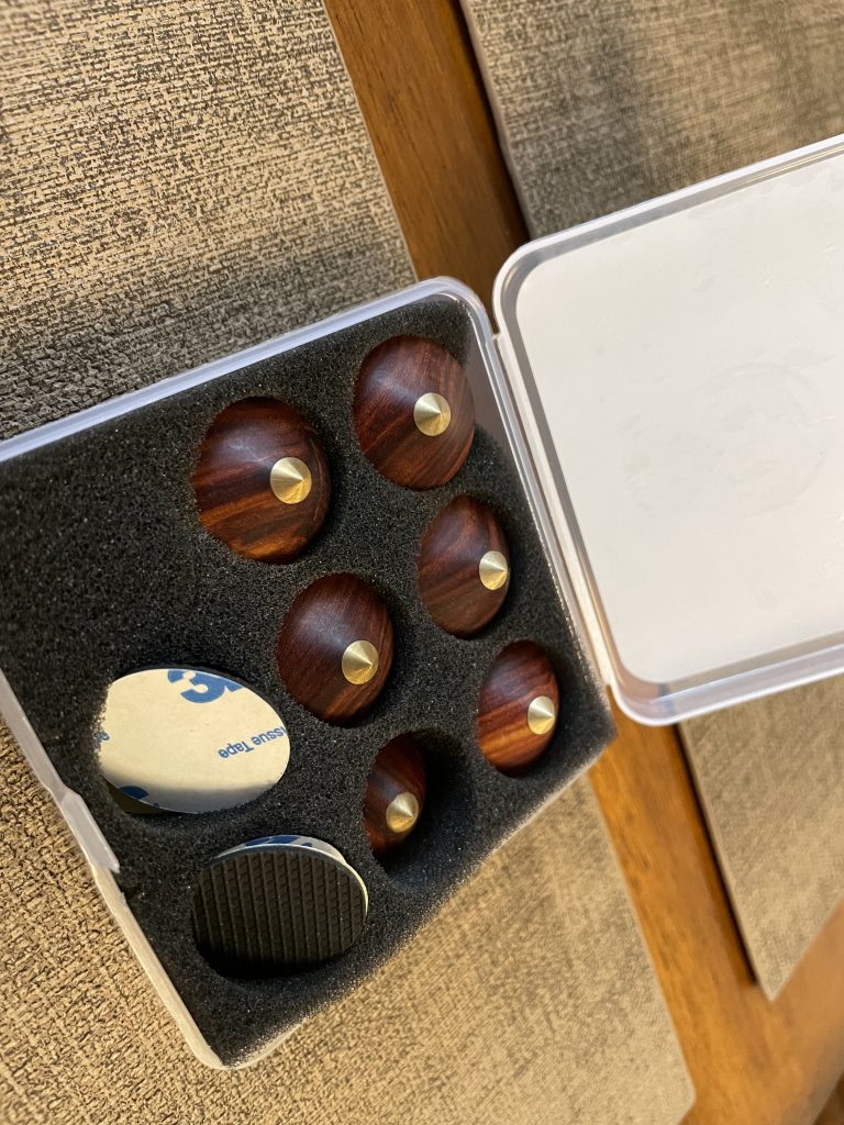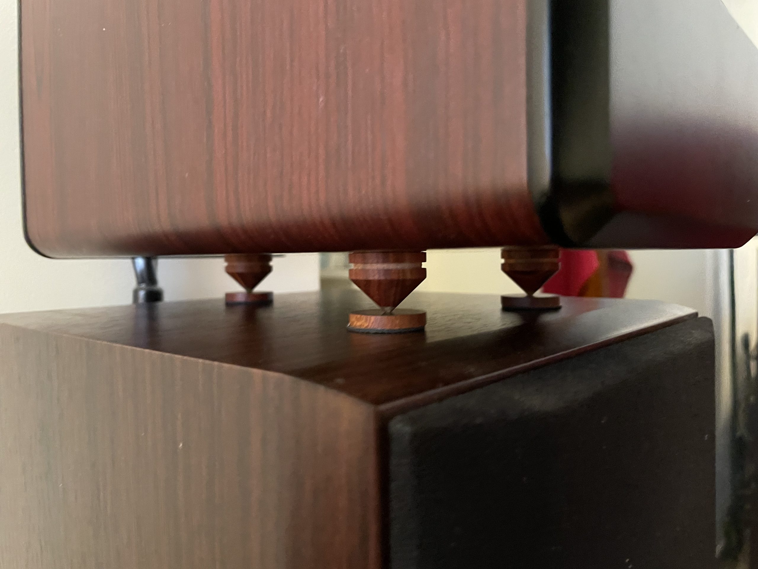因为反射音箱压在主音箱上,多多少少都会有一定影响,例如高频延伸低音时互相震动,这时就需要避震,尽量减少上下音箱震动干扰。超级喜欢这种木脚钉,特别是木色每只都独一无二……