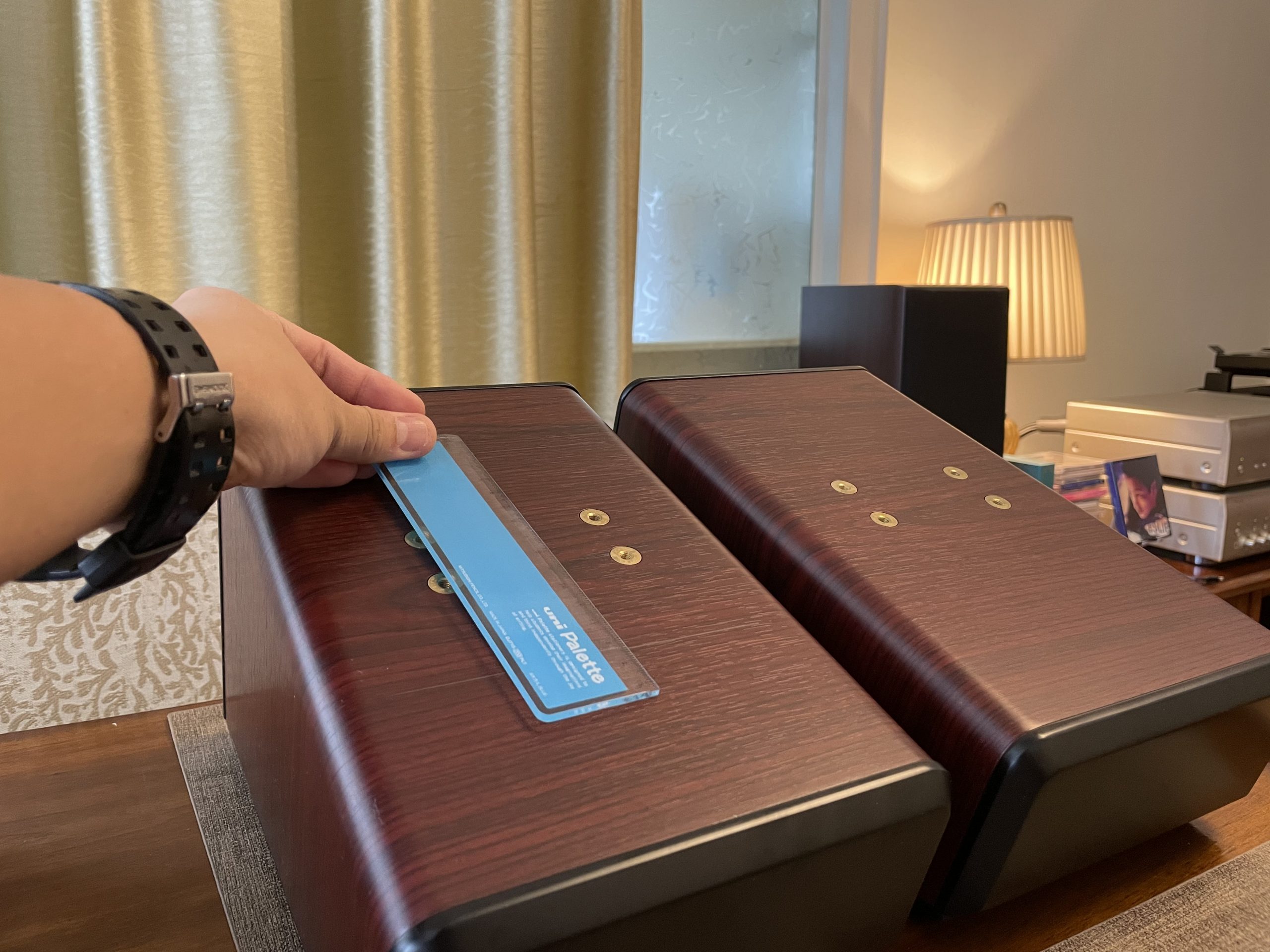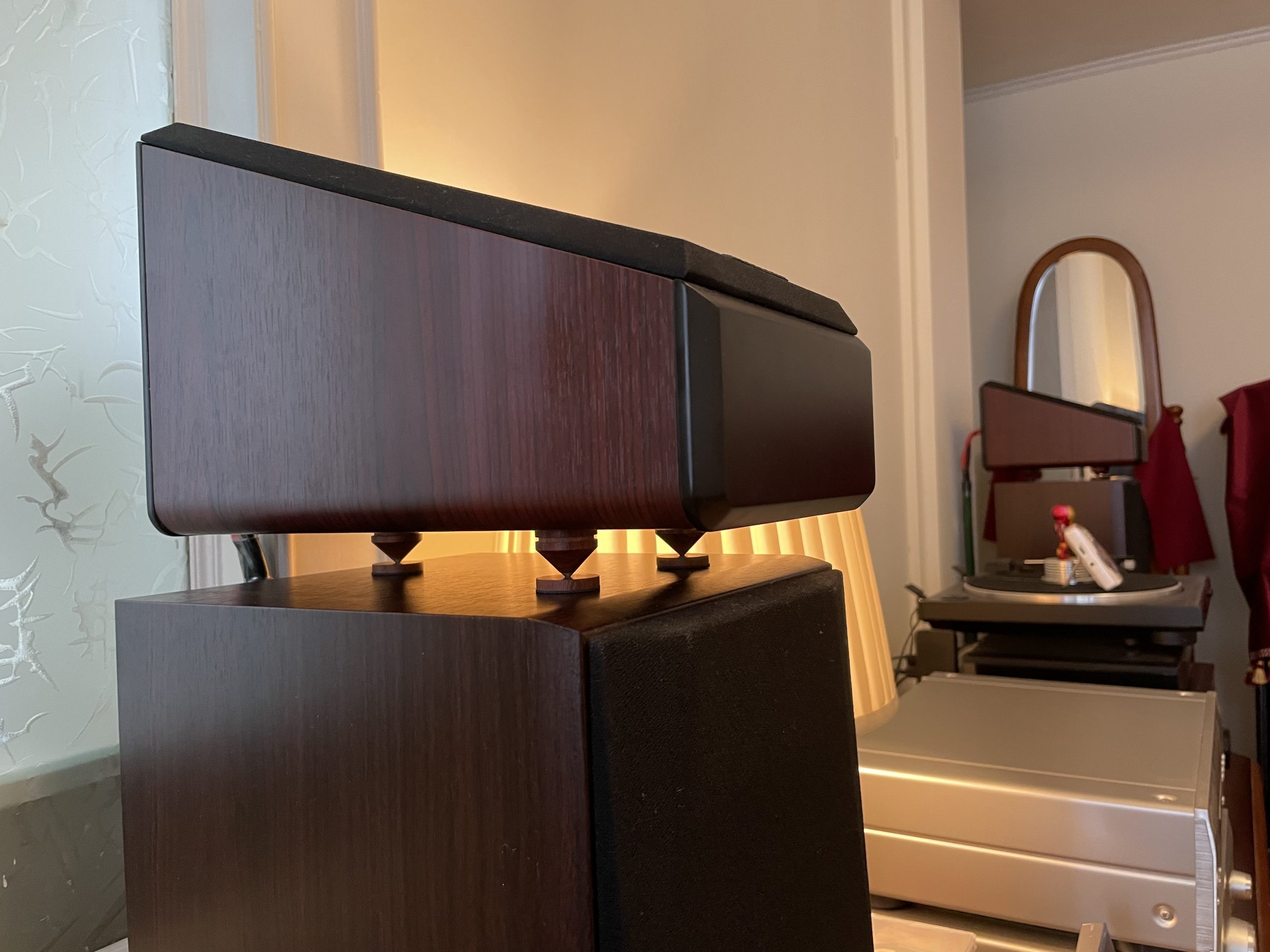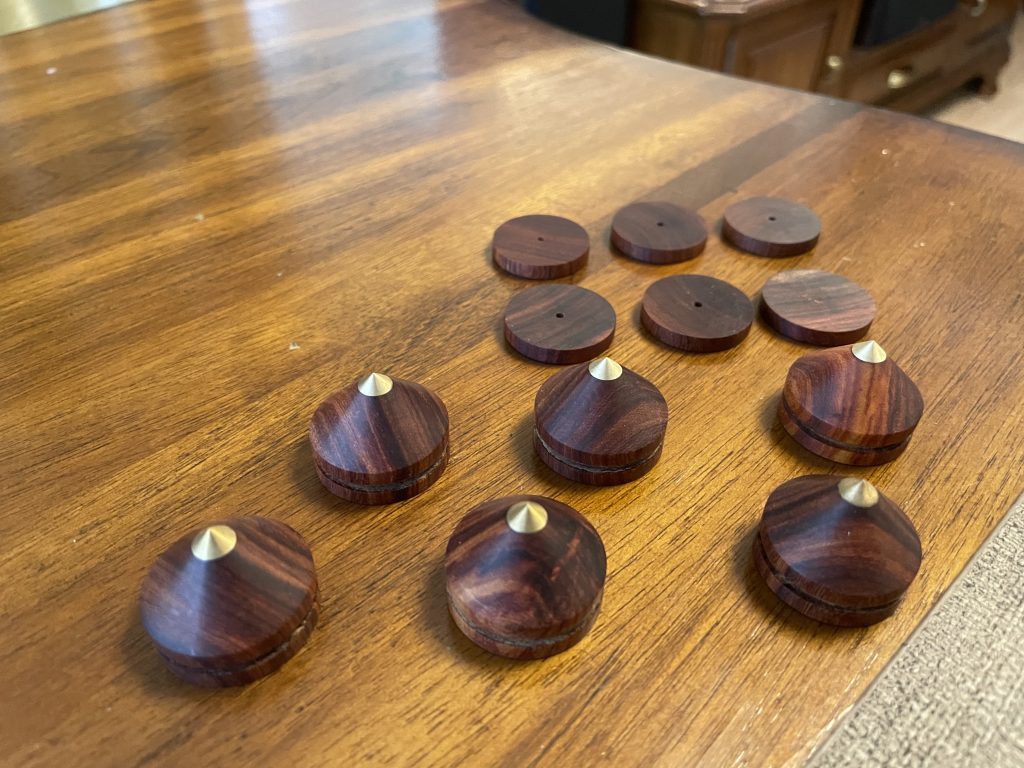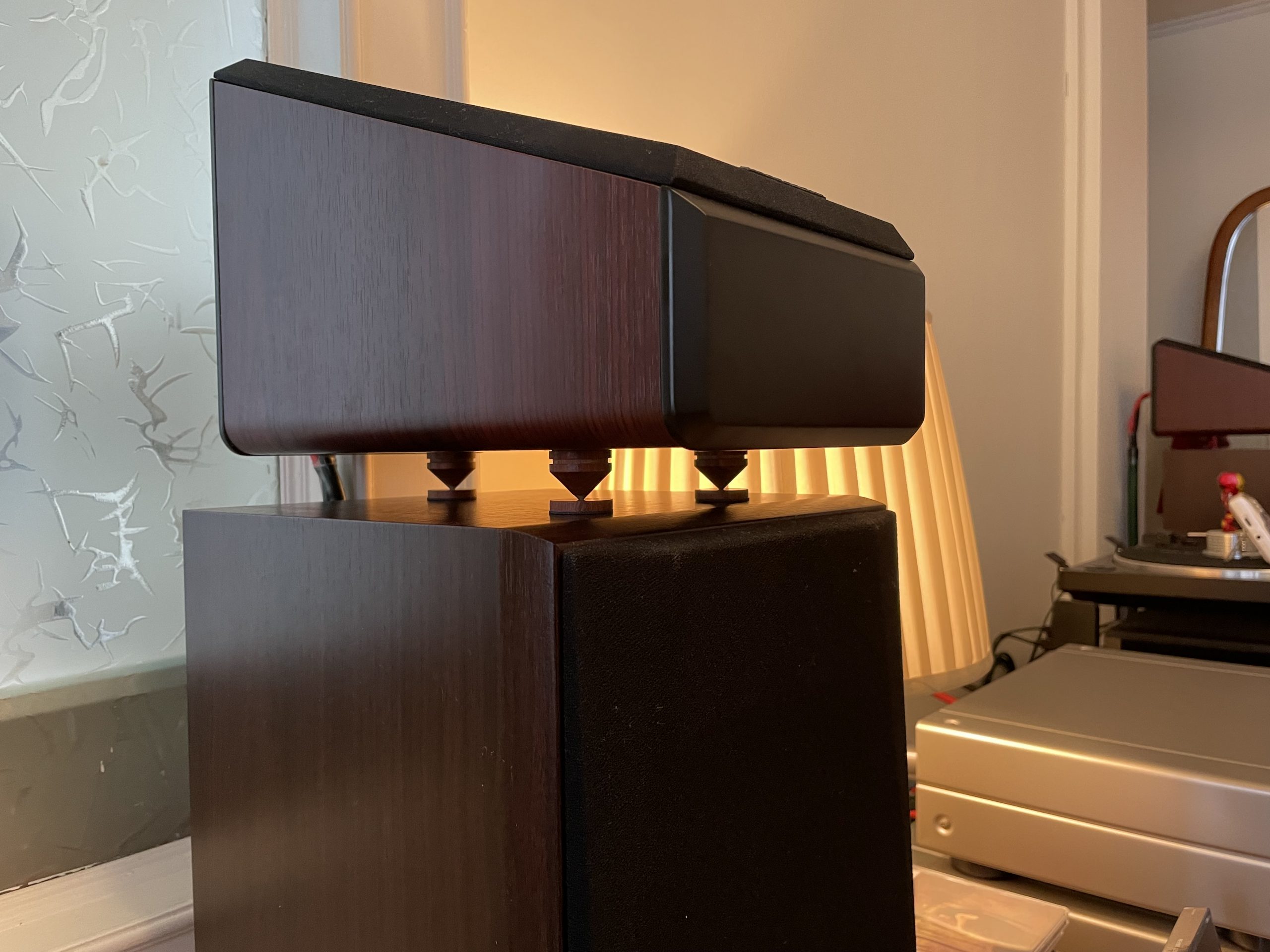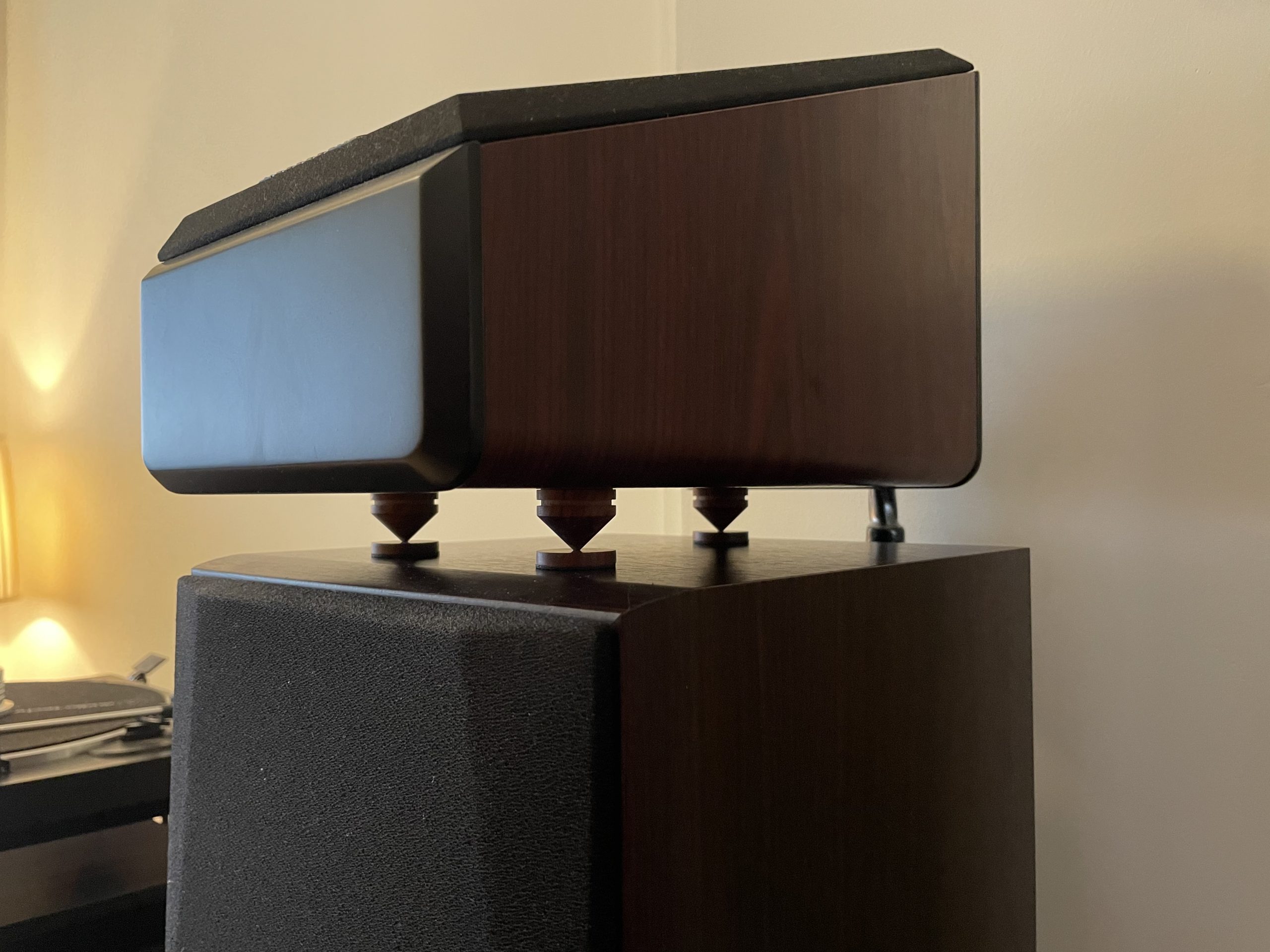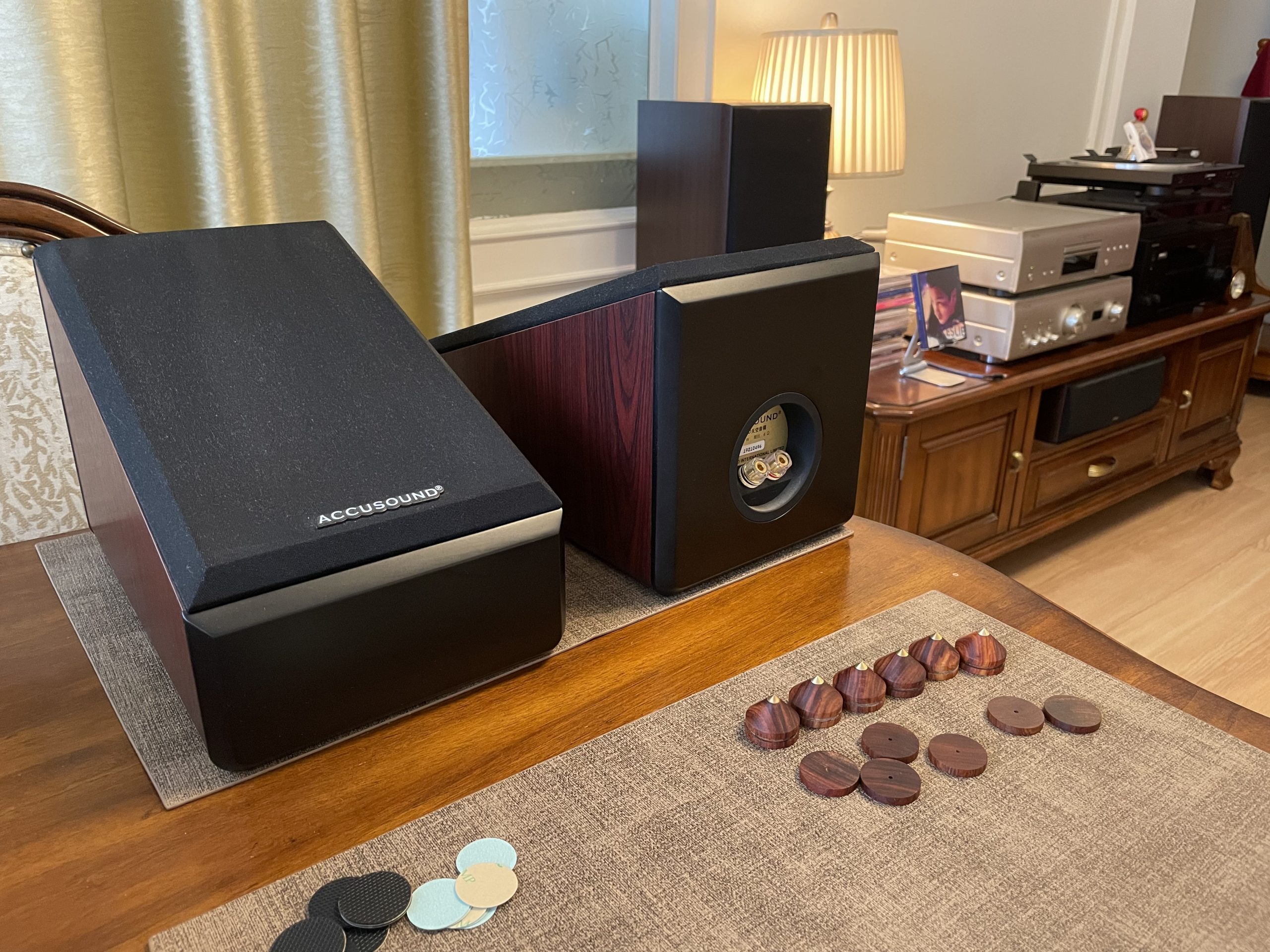 因为反射音箱压在主音箱上,多多少少都会有一定影响,例如高频延伸低音时互相震动,这时就需要避震,尽量减少上下音箱震动干扰。超级喜欢这种木脚钉,特别是木色每只都独一无二……