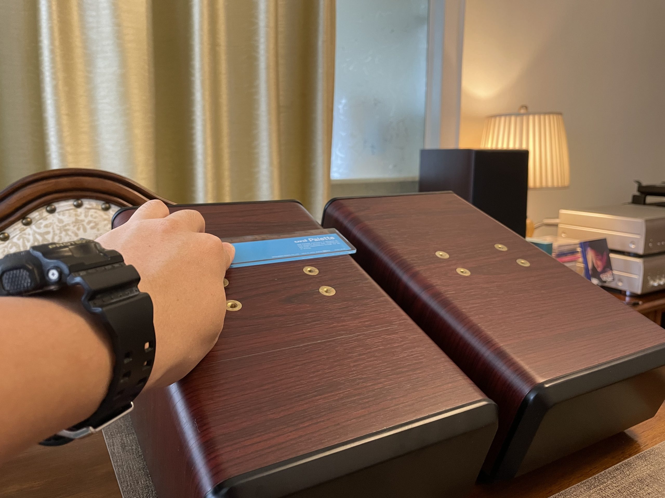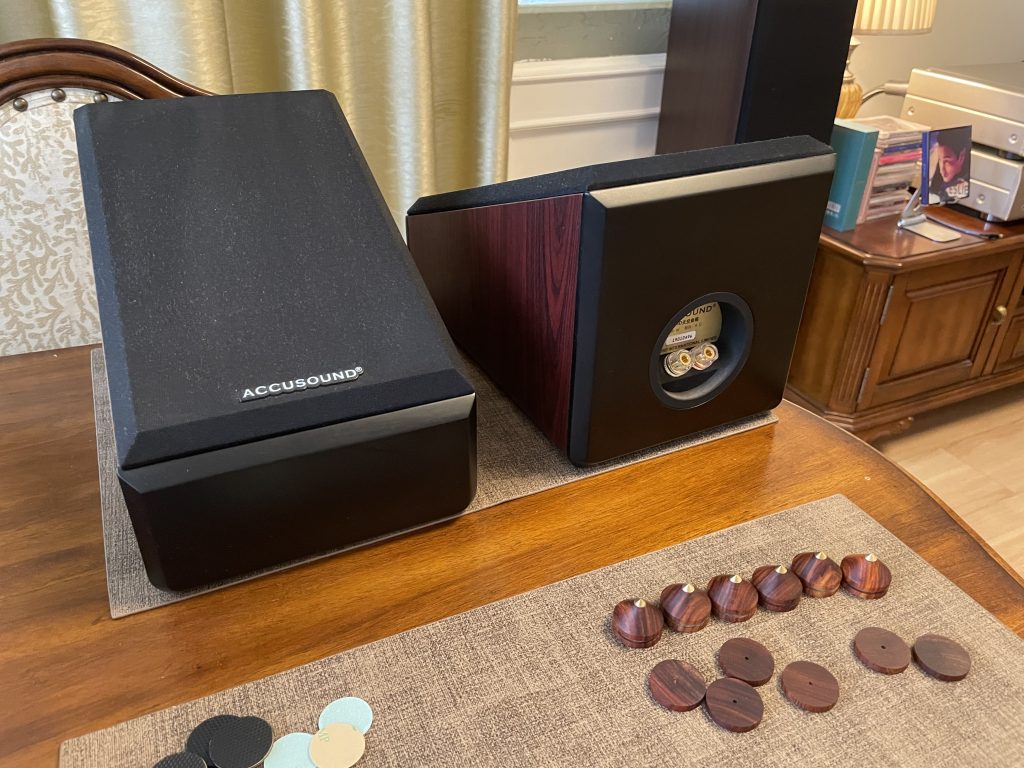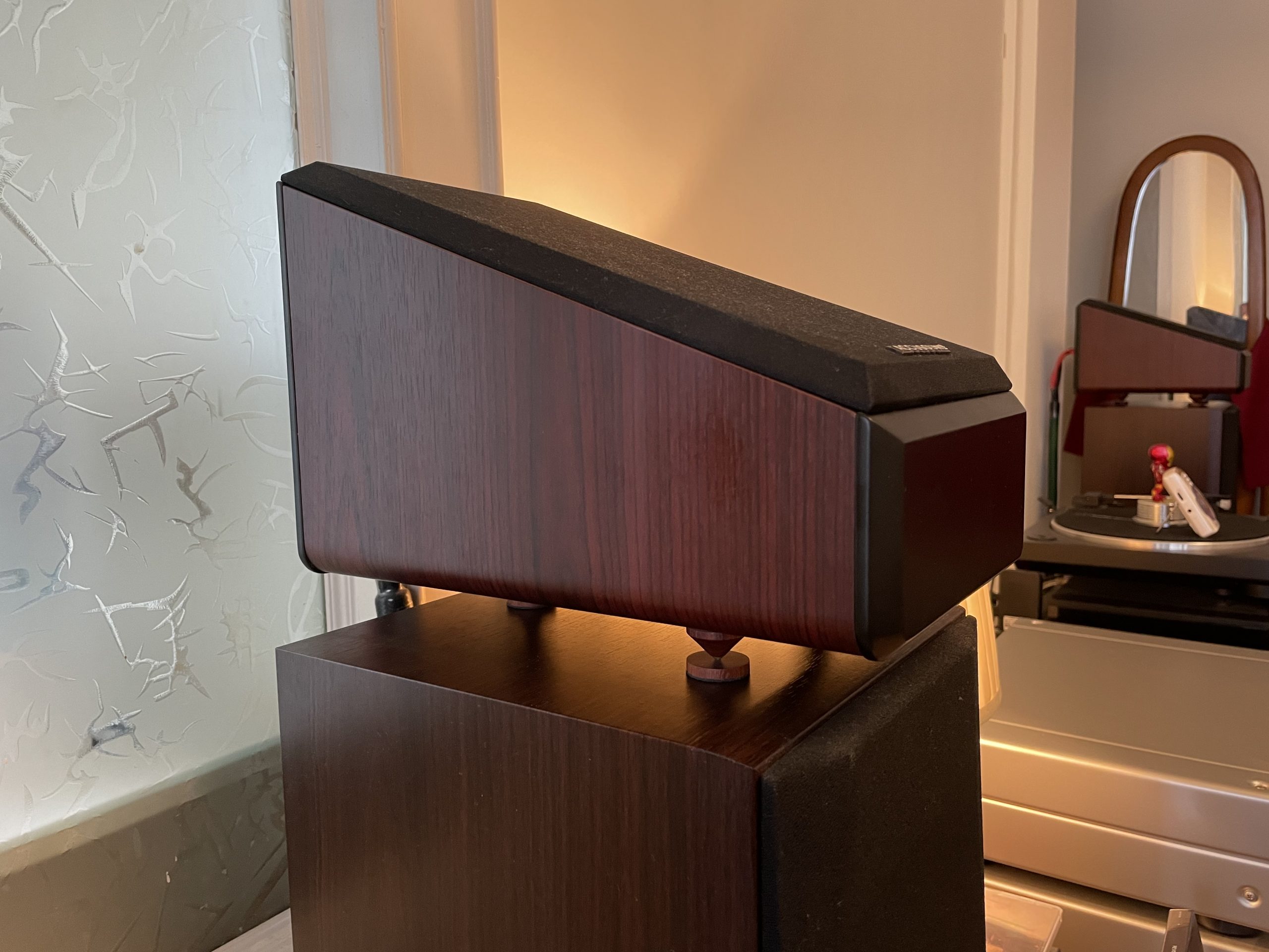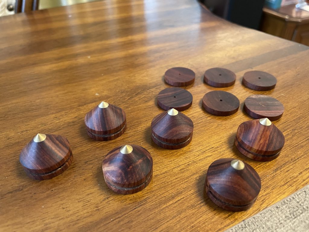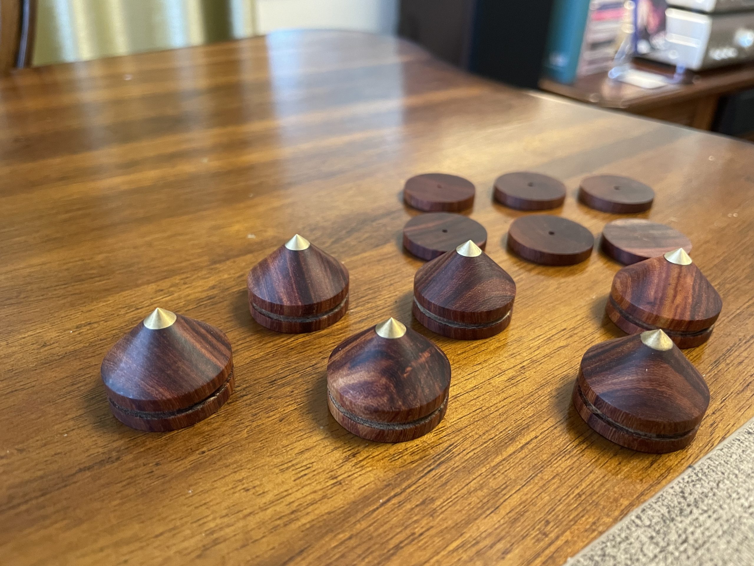 因为反射音箱压在主音箱上,多多少少都会有一定影响,例如高频延伸低音时互相震动,这时就需要避震,尽量减少上下音箱震动干扰。超级喜欢这种木脚钉,特别是木色每只都独一无二……
