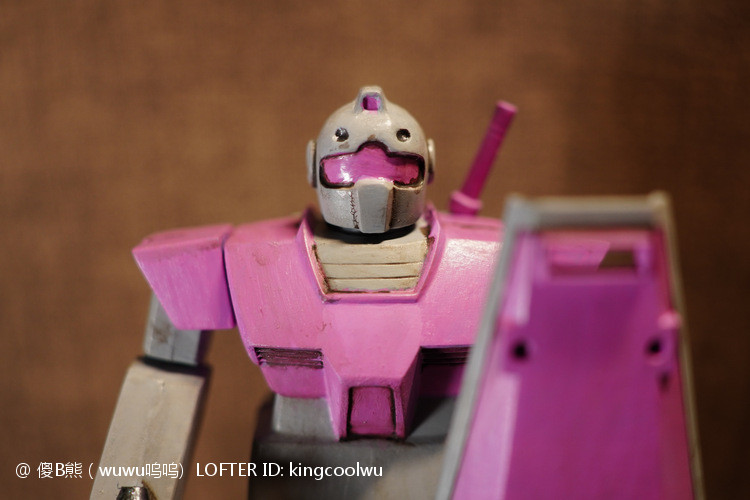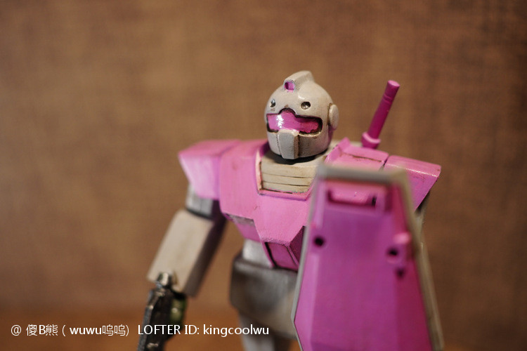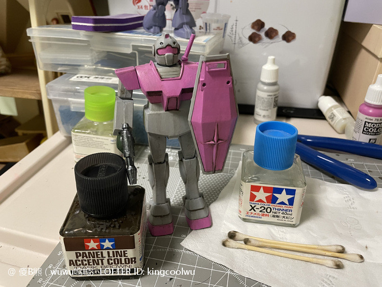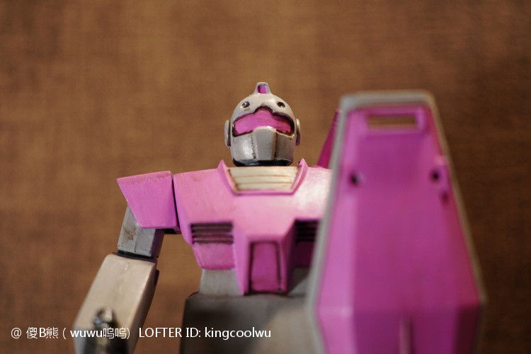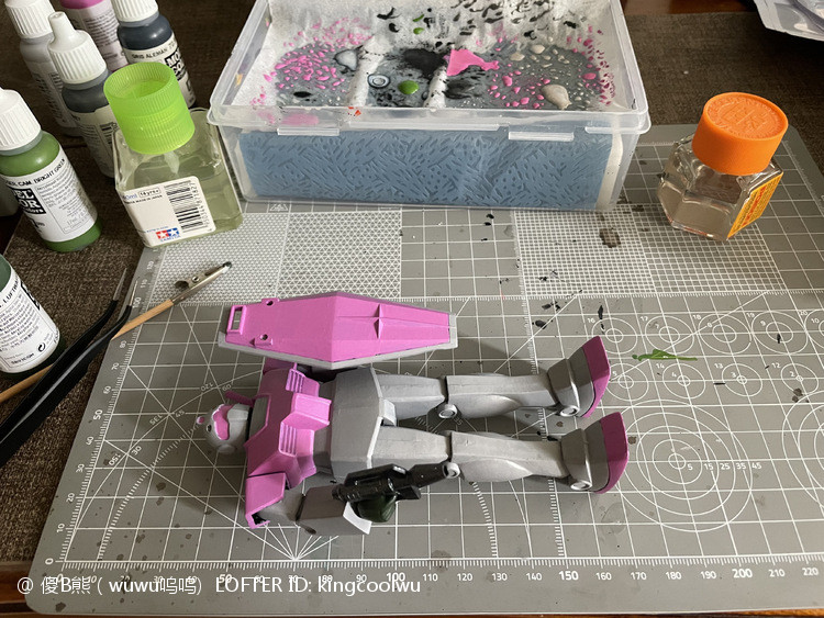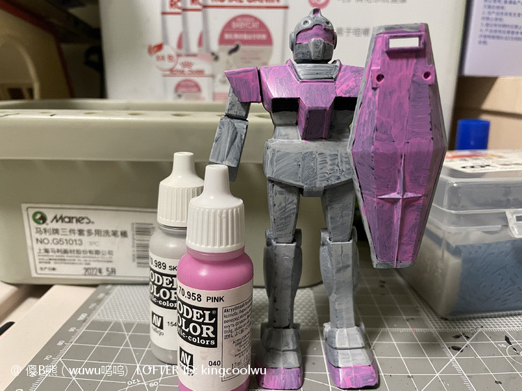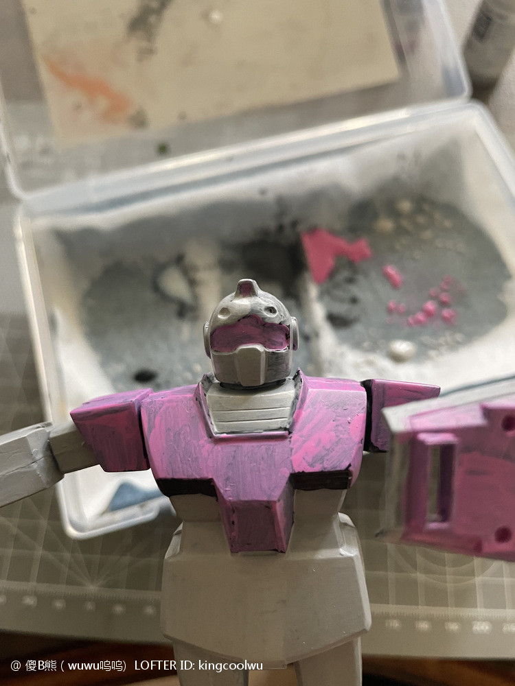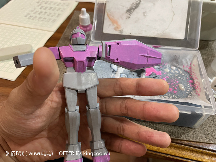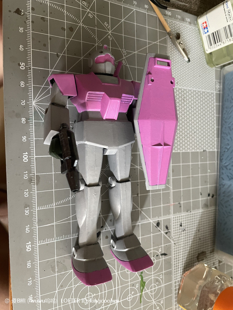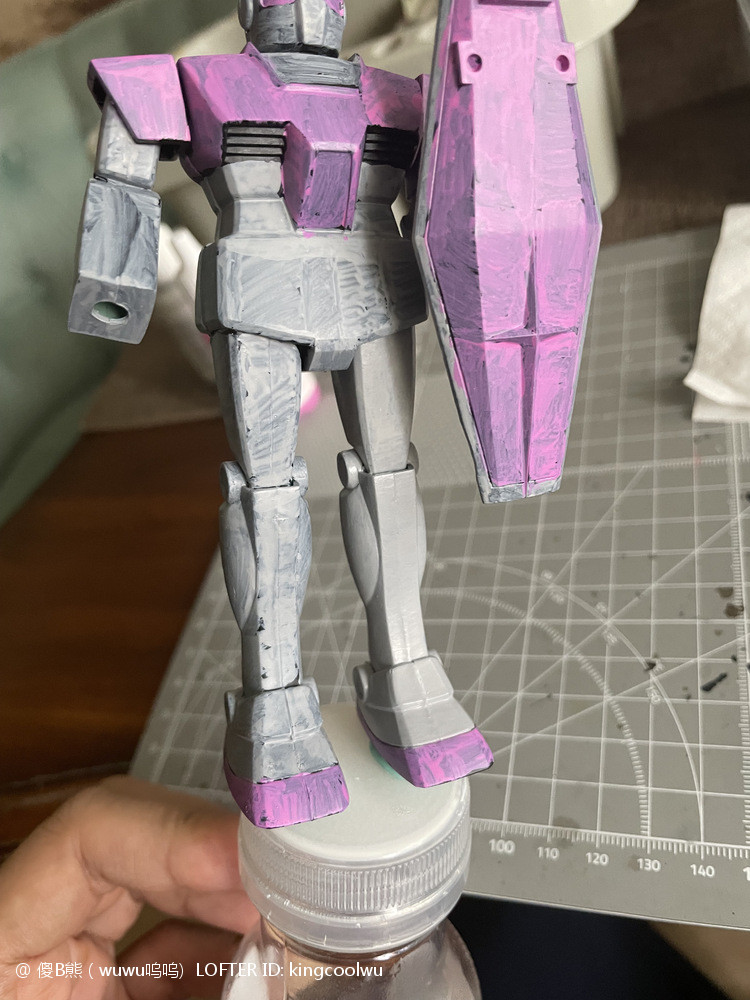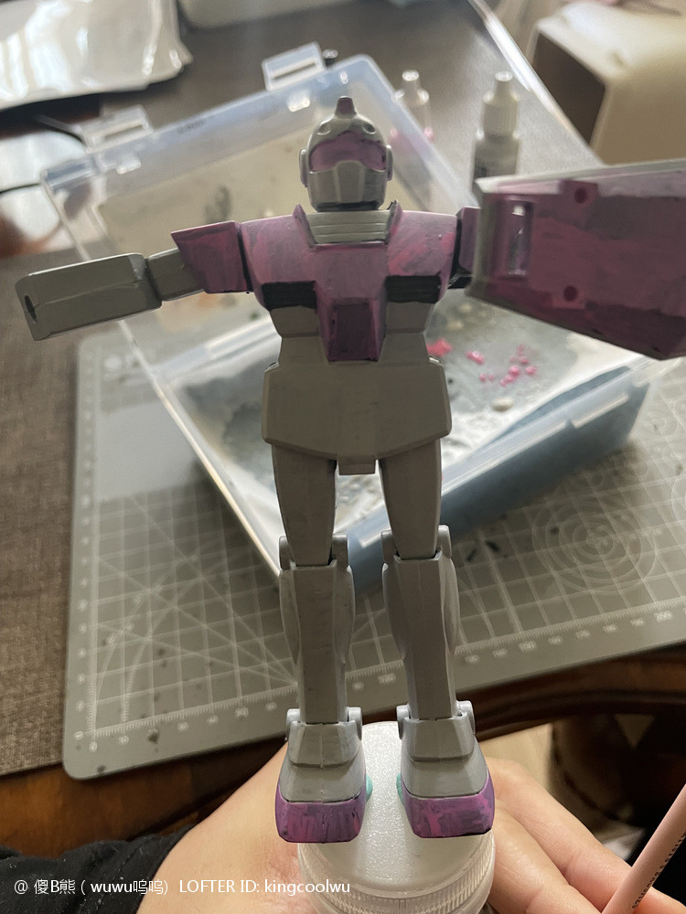 所以在制作这款模型时候,配色想独一无二,由于女性机,我自己首选当然是紫色,想和自己汽车搭配!但由于疫情封控,无办法购买油漆,只能用现有。手上只有AV的粉红色,在上次制作情景时我也说到这个粉红色有点像玫红。实际上搭配在GM上还是挺不错,而四肢部位使用天空灰,而不是常规白色或者什么钢弹白;一来我不喜欢白色、二来白色笔涂很难上色。