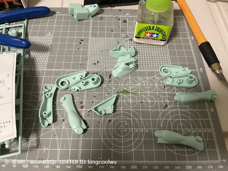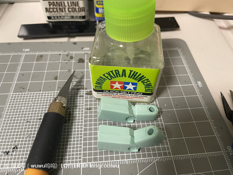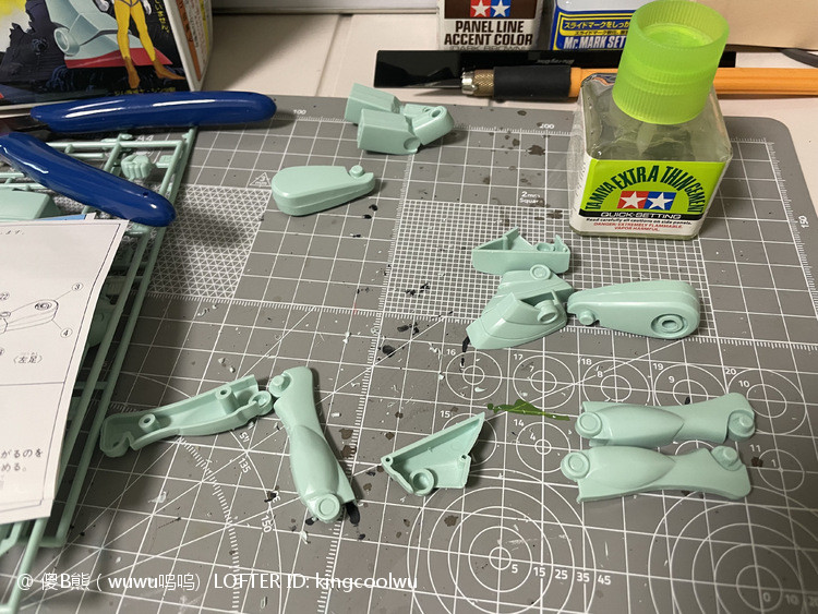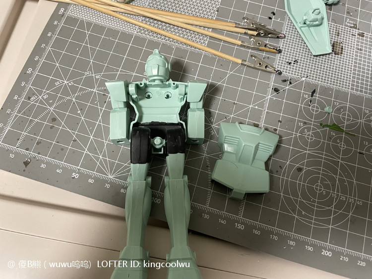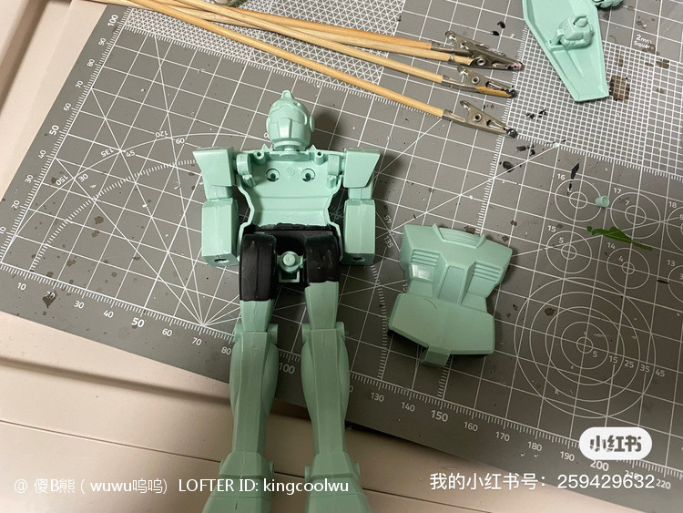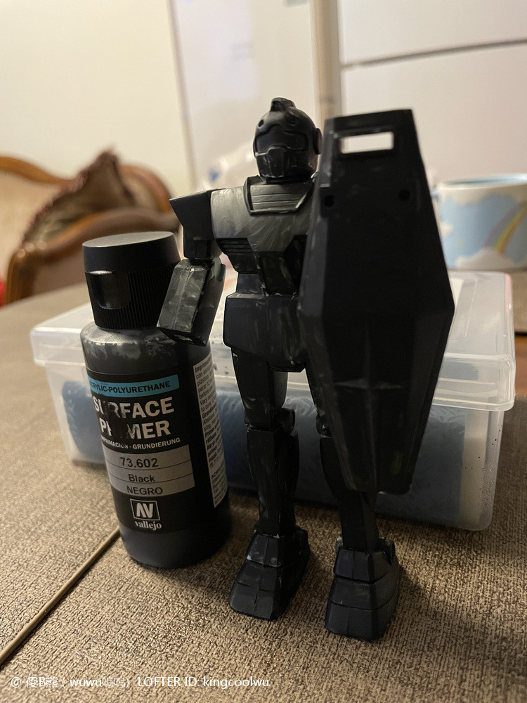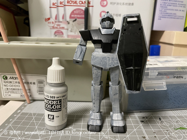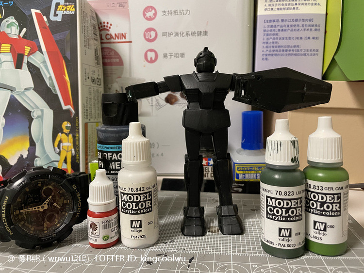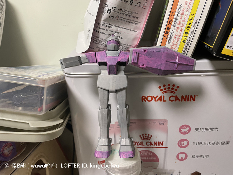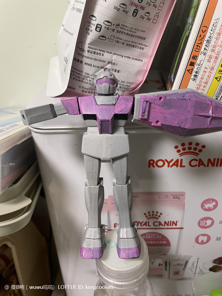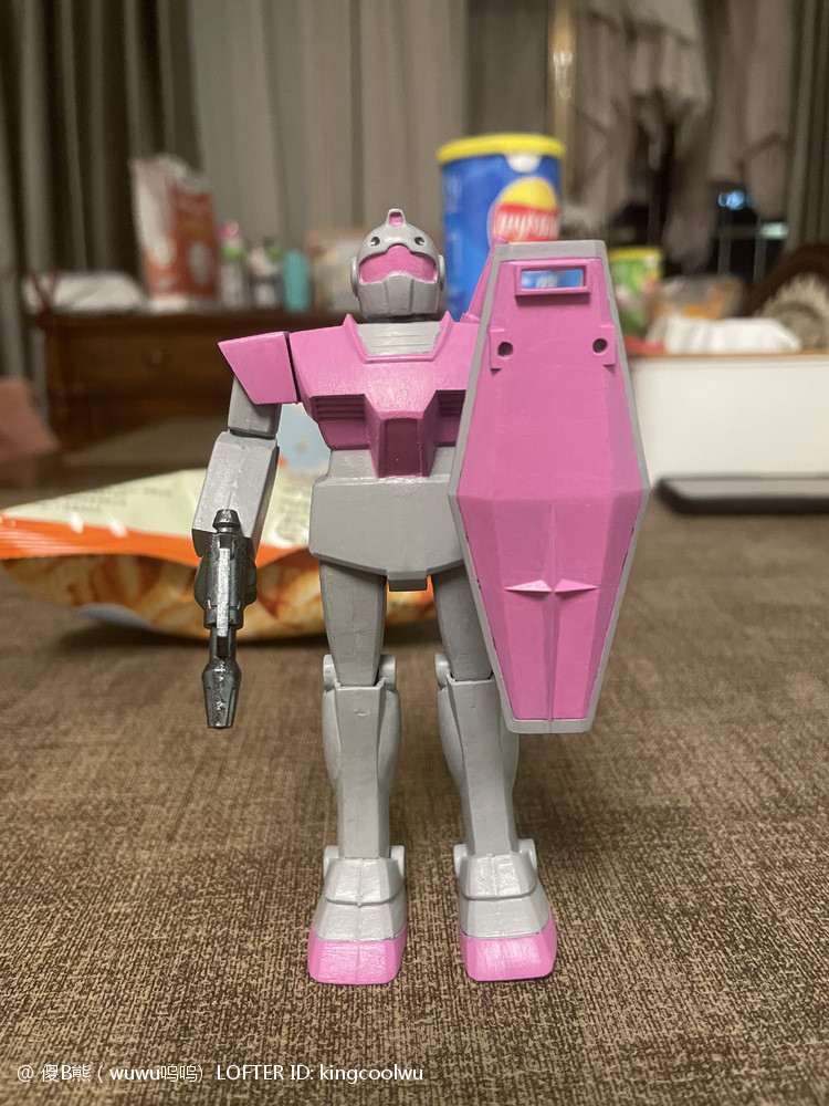 所以在制作这款模型时候,配色想独一无二,由于女性机,我自己首选当然是紫色,想和自己汽车搭配!但由于疫情封控,无办法购买油漆,只能用现有。手上只有AV的粉红色,在上次制作情景时我也说到这个粉红色有点像玫红。实际上搭配在GM上还是挺不错,而四肢部位使用天空灰,而不是常规白色或者什么钢弹白;一来我不喜欢白色、二来白色笔涂很难上色。